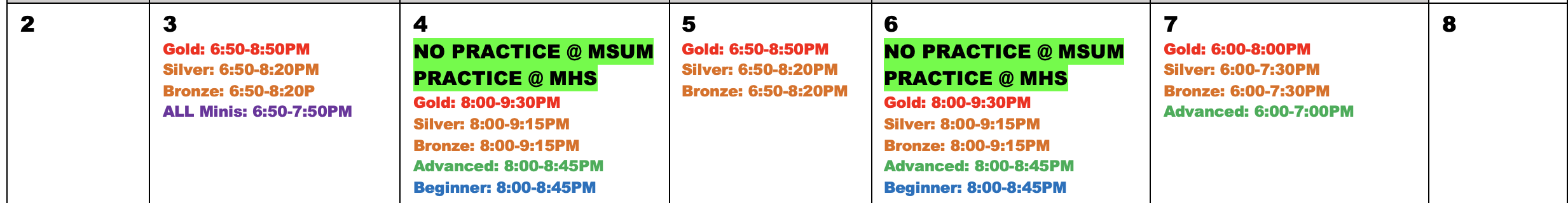 We have practice Monday - Friday. Monday, Wednesday and Friday will be at MSUM. Tuesday and Thursday will be at Moorhead High School. For Moorhead High School practice, please do not show up before 7:45PM.