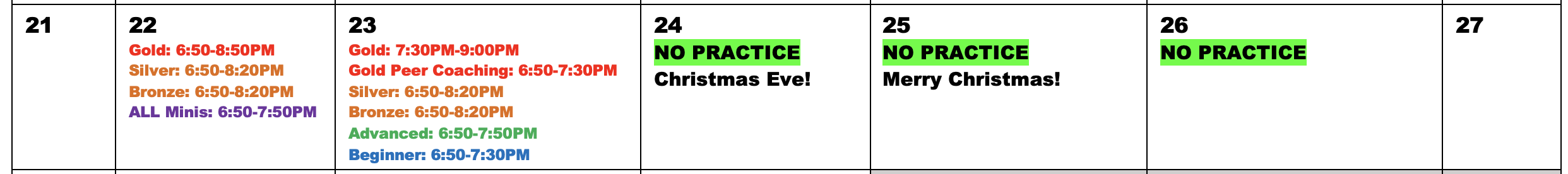We have practice on Monday and Tuesday this week at MSUM. We do not have practice on Wednesday, Thursday or Friday due to the holiday! We want Red Dragons to enjoy time with their families! Gold will be peer coaching the Minis on Tuesday and needs to arrive by 6:50PM in their suits.